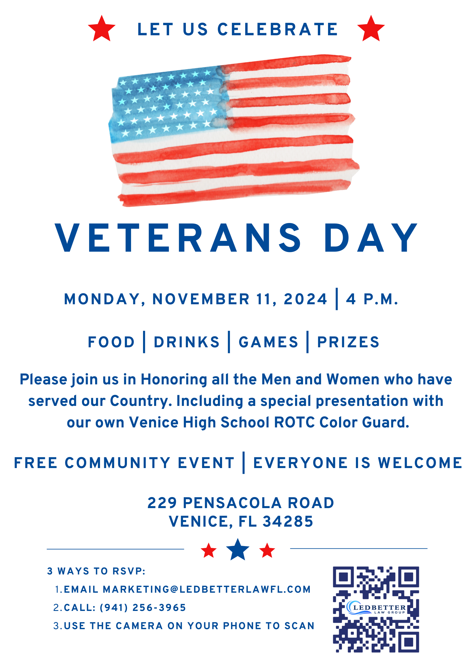 Please join us in honoring all the men and women who have served our country. This year Ledbetter Law Group would like to celebrate by honoring our veterans with an evening of food from Darrell’s Restaurant, drinks, games and prizes. Including a special presentation with our own Venice High School ROTC Color Guard.